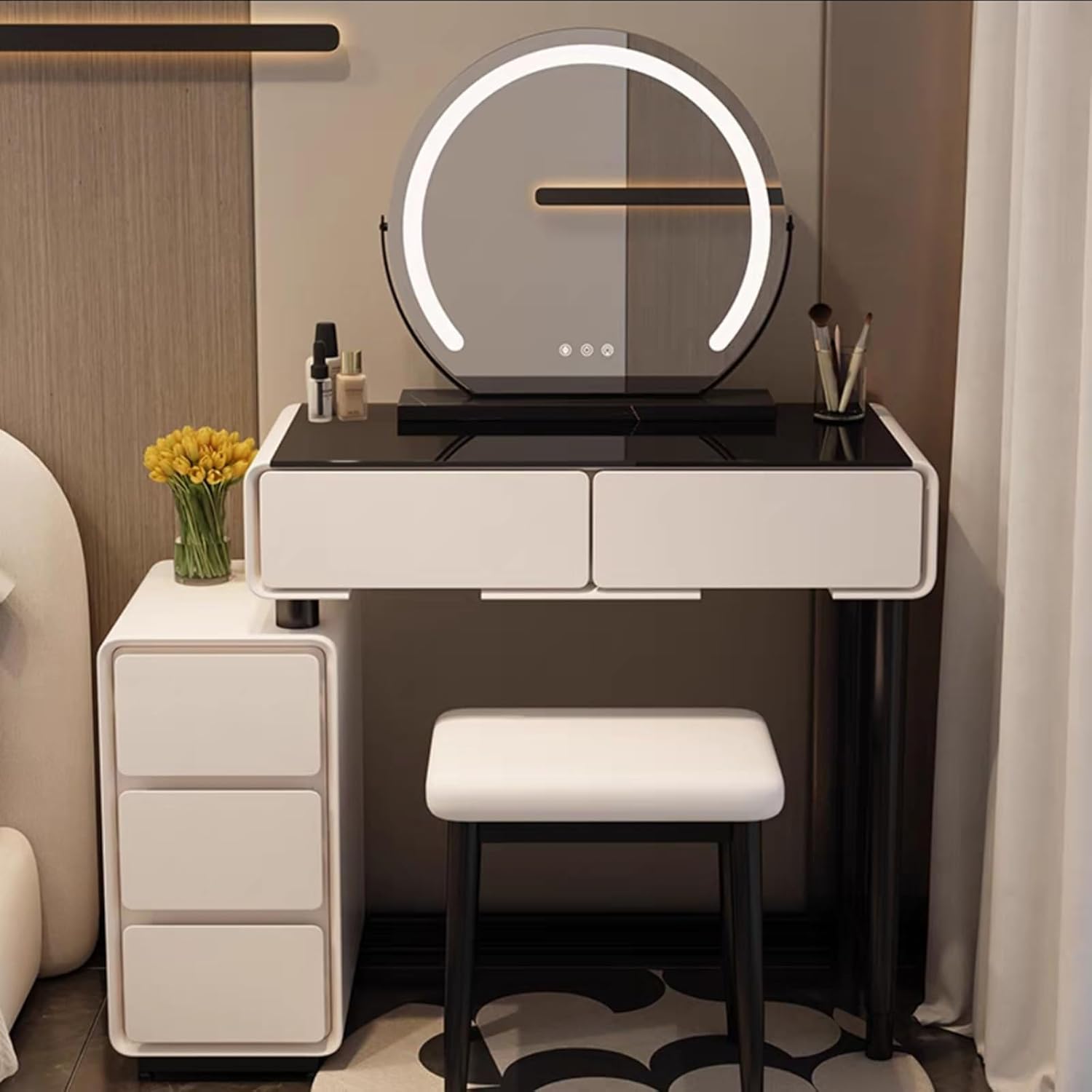 Scrivania di lusso con luci e sedia, tavolo da trucco in legno massello, design retrattile, cassetti di grande capacità, nessuna installazione necessaria, elegante sedia rotonda grigia 100 cm