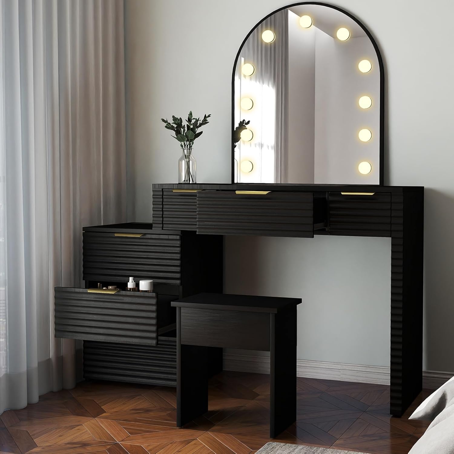 Set da trucco a LED con specchio e luci, tavolo da toeletta nero con sgabello e caricatore USB, 3 modalità di colore, ideale per camera da letto e spogliatoio