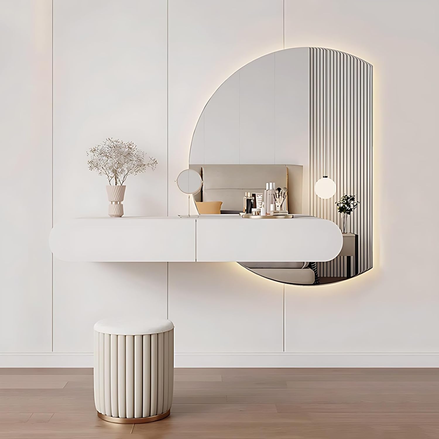 Set da trucco multifunzionale con specchio LED intelligente e 2 cassetti tavolo da toeletta a parete, include elegante sgabello per il trucco, specchio a mezzaluna 81 cm
