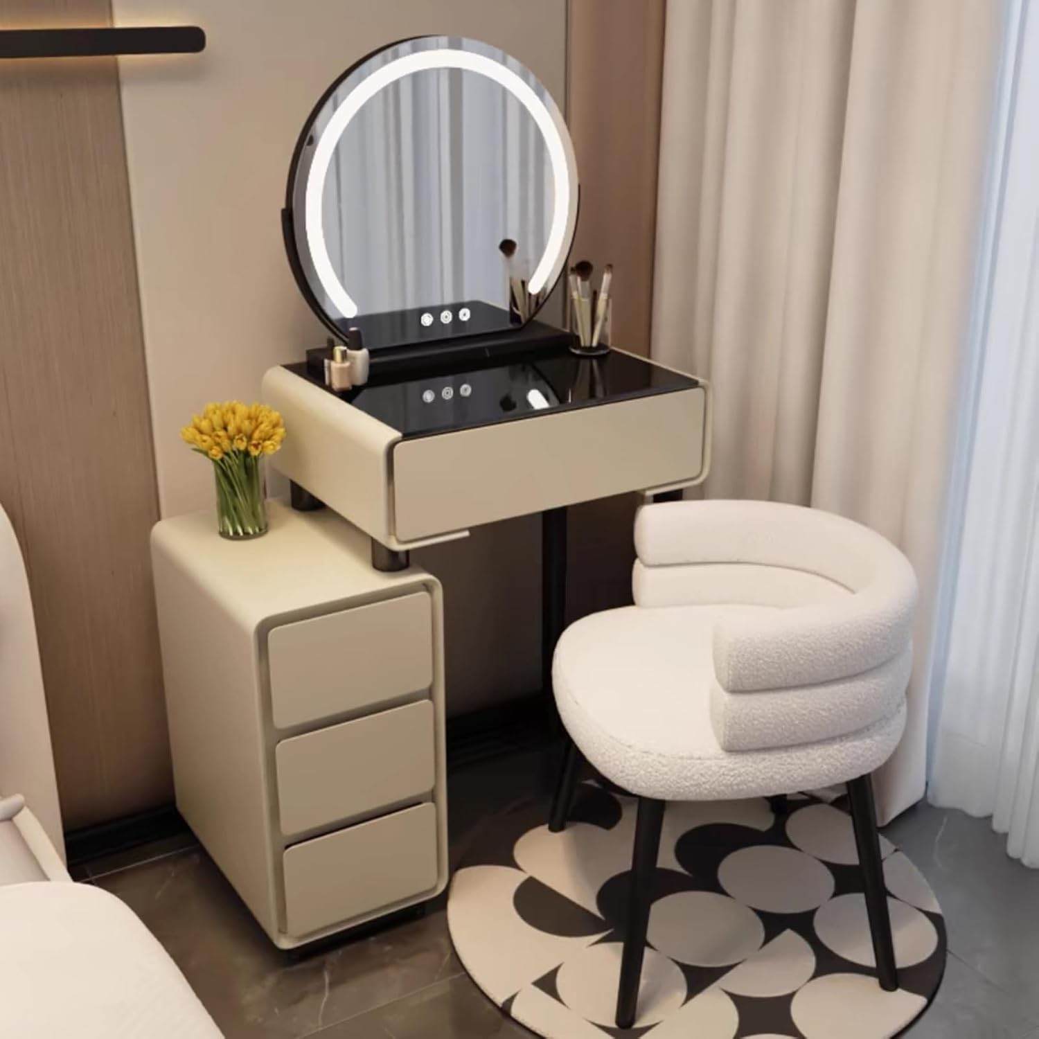 Set da toeletta imbottito con luci rotonde in 3 colori, elegante tavolo da toeletta e armadietto laterale con cassetti per camera da letto, perfetto per ragazze e donne.